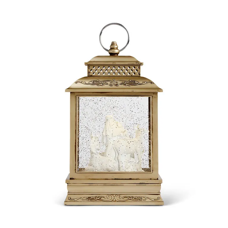 - Demdaco lantern features a scene depicting Baby Jesus, Mary, Joseph and manger animals and LED light.