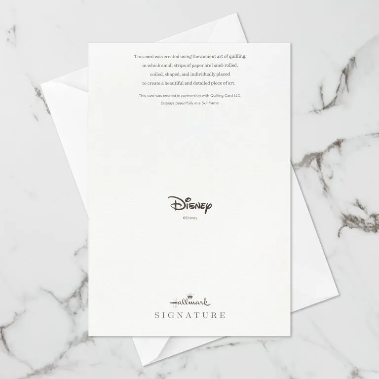Greeting card features an intricate quilled paper design of Disney Princess Tiana from “The Princess and the Frog.” Greeting is a work of art that displays beautifully in a 5×7 frame (sold separately), making it an unforgettable way to share wishes of fairytale happiness for a birthday, wedding and more. Crafted using the ancient art of quilling, in which small strips of paper are hand-rolled, coiled, shaped and individually placed to create a beautiful and detailed piece of art, this Hallmark Signature card was designed in collaboration with Quilling Card LLC, a company seeking to promote the art of paper quilling.