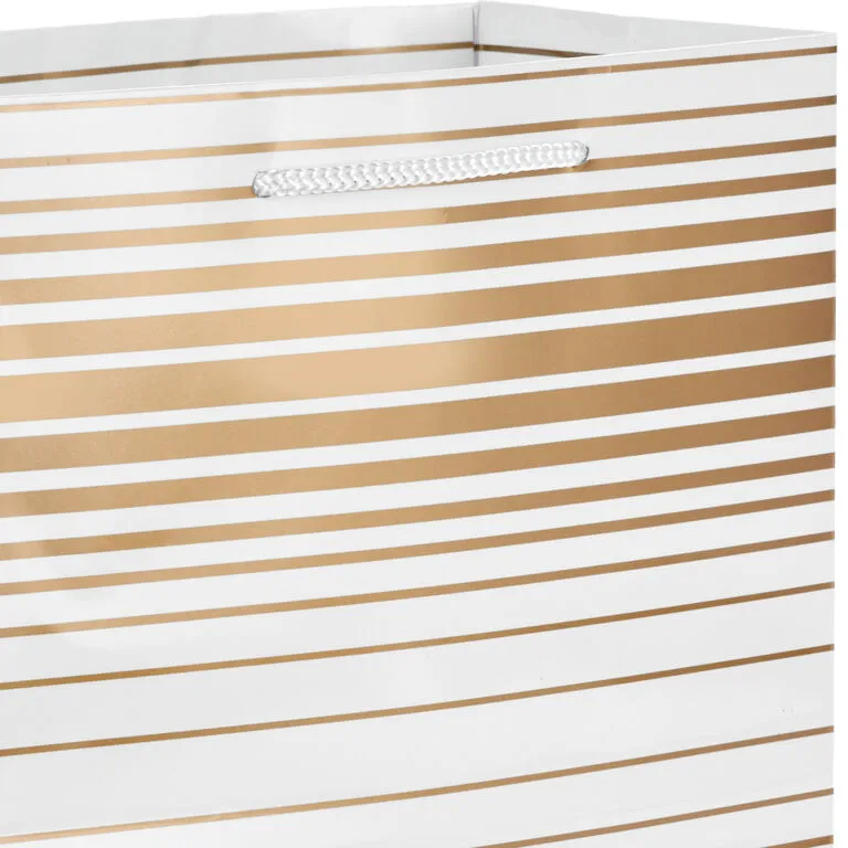 Bring shimmer and shine to birthdays or other special gift-giving occasions with this set of metallic-patterned gift bags. Pack of six bags include two of each size, all with shiny gold metallic ink accents. Two medium-size bags hold gifts like video games, DVDs, books and candles. Two large-size bags hold items such as toys, stuffed animals, puzzles and clothing. And two XL bags are generously sized to hold larger presents or multiple items of clothing, toys, and games.