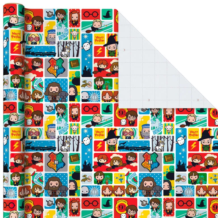 Elevate your gift-giving game with this trio of Harry Potter-themed wrapping paper rolls. Gift wrap assortment includes fun designs like the house crests from Hogwarts School of Witchcraft and Wizardry, illustrations of the Marauder’s Map, and colorful stylized drawings of Harry, Hermione, Ron, Hagrid and more. This three-pack of high-quality Hallmark gift wrap is perfect for kids and adults alike—and it makes a great choice for birthdays, graduations, baby showers, themed weddings and more. Each premium paper roll includes a cutting grid on reverse to ensure straight lines.