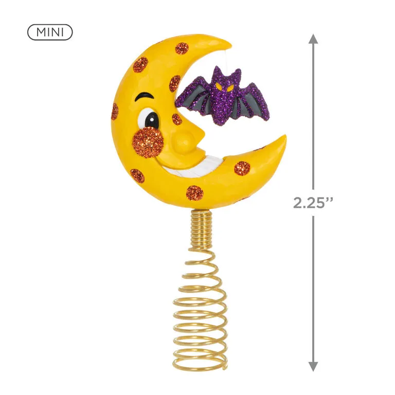 Gather your mini Halloween ornaments and create a spooktacular display with this miniature tree skirt and tree topper. A seasonally colorful black, orange and purple design of jack-o’-lanterns, bats and a moon decorates the small fabric tree skirt. Then top your tabletop tree with the coordinating moon and bat tiny tree topper that boasts sparkling glitter accents and a metal spring coil base.