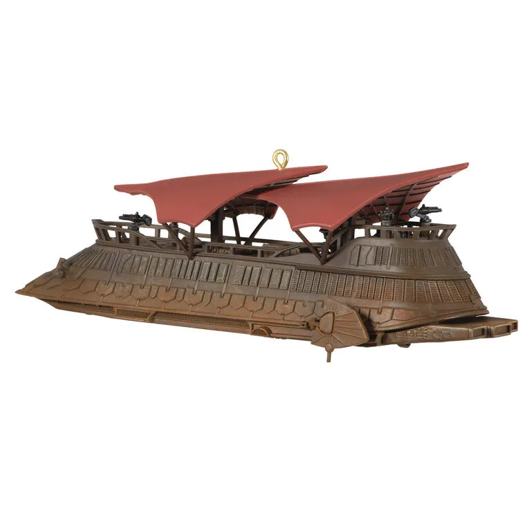 Jabba the Hutt used his luxury sail barge to visit Tatooine’s Sarlacc pit, where Han Solo, Luke Skywalker and Chewbacca were to be publicly executed. This Christmas tree ornament depicts that massive transport, the Khetanna, from Star Wars: Return of the Jedi. Press the button on the ornament to play audio from the unforgettable scene (battery-operated).