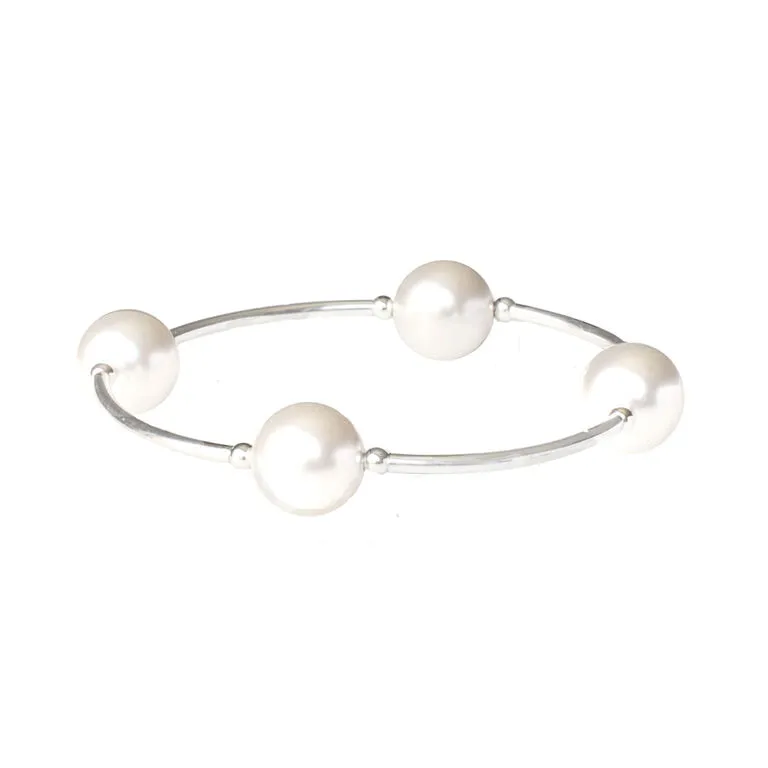 Remember the blessings in your life daily with this elegant Blessing Bracelet on your wrist. Made with four 12 mm simulated white pearl beads (known as the peace stone) between sterling silver tubes, this elegant stretch bracelet features a timeless and classic design. Whether you wear it alone or stacked with other bracelets, it is a precious reminder of all you have to be grateful for and gives you a starting point in the practice of gratitude. White pearl beaded bracelet comes with a beautiful note card bearing a message about the meaning behind the beads. It makes a lovely gift for yourself, a friend or a family member.