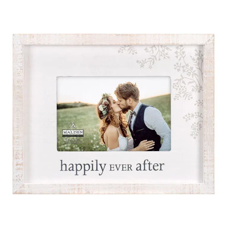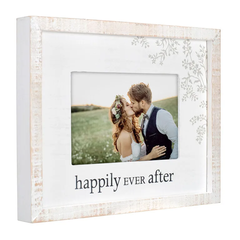 Showcase a favorite photo from your special day in this beautiful picture frame. Weathered white frame with a wood mat featuring a gray floral design holds a horizontal 4×6 photo. Perfect for a wedding shower or wedding gift or to display on a shelf or tabletop in your own home.