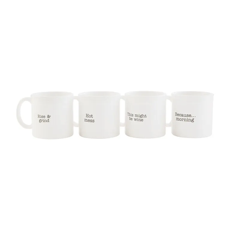 - Set of 4 ceramic mugs feature embossed rims and different funny messages.